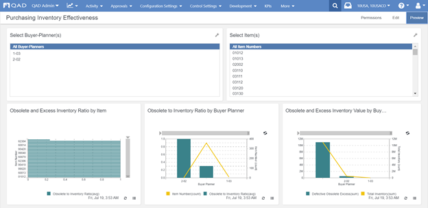 O ERP adaptável da QAD inclui o centro de ação de eficácia do estoque de compras para ajudar as empresas monitorar a integridade de seu estoque.