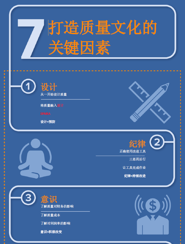 拥有质量文化的公司不会到处“灭火”。这是因为他们从一开始就布局质量,练习正确使用改进和解决问题的工具,而组织内部的每个人都真正了解质量对组织产生的财务影响。这种对质量的关注可降低他们的风险、改善责任制和提高客户满意度,并要求公司不断改进。换言之,它们不是在解决问题,而是在预防问题。