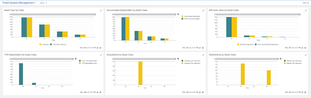 Mostra o custo de todos os ativos, segregados por classe de ativos. Mostra o ano atual e um ano anterior, permitindo ao usuário monitorar tendências nos investimentos ou baixas de ativos da organização. Embora as classes reflitam as grandes categorias de ativos imobilizados, como terrenos, edifícios, equipamentos de fábrica e equipamentos de escritório, elas também distinguem as subcategorias que determinam a vida útil e a depreciação das contas GL. Por exemplo, “laptops e PCs” são uma classe separada na categoria de equipamentos de escritório.