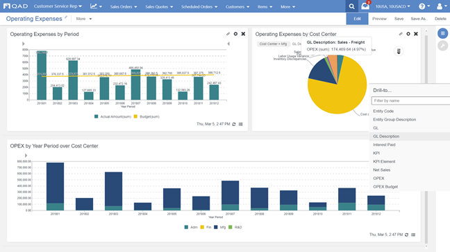 Os Centros de ação da QAD fornecem análises para ajudar gerentes e usuários a monitorar métricas e KPIs. Os destaques de KPI para o centro de ação das despesas operacionais incluem: