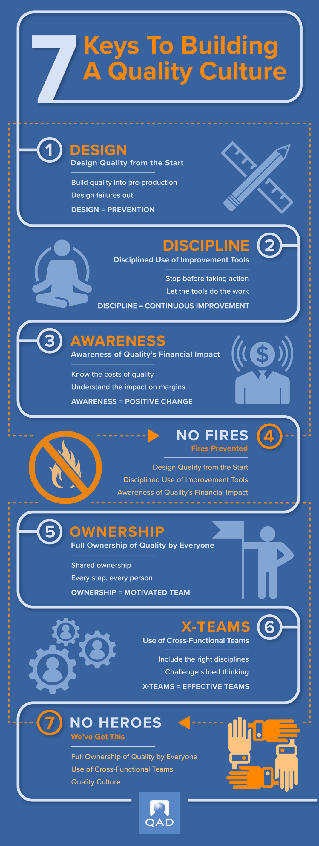 ¿Es posible crear una verdadera cultura de la calidad dentro de su organización? La respuesta corta es sí. Pero es una lucha para la mayoría de las empresas. Desde 1979 QAD ha trabajado con muchas organizaciones de manufactura en muchos mercados - algunas han luchado con la creación de una cultura de calidad y otras han sobresalido. Lo que esperamos compartir con usted en esta entrada del blog es lo que hemos identificado como las 7 claves para construir una cultura de calidad.