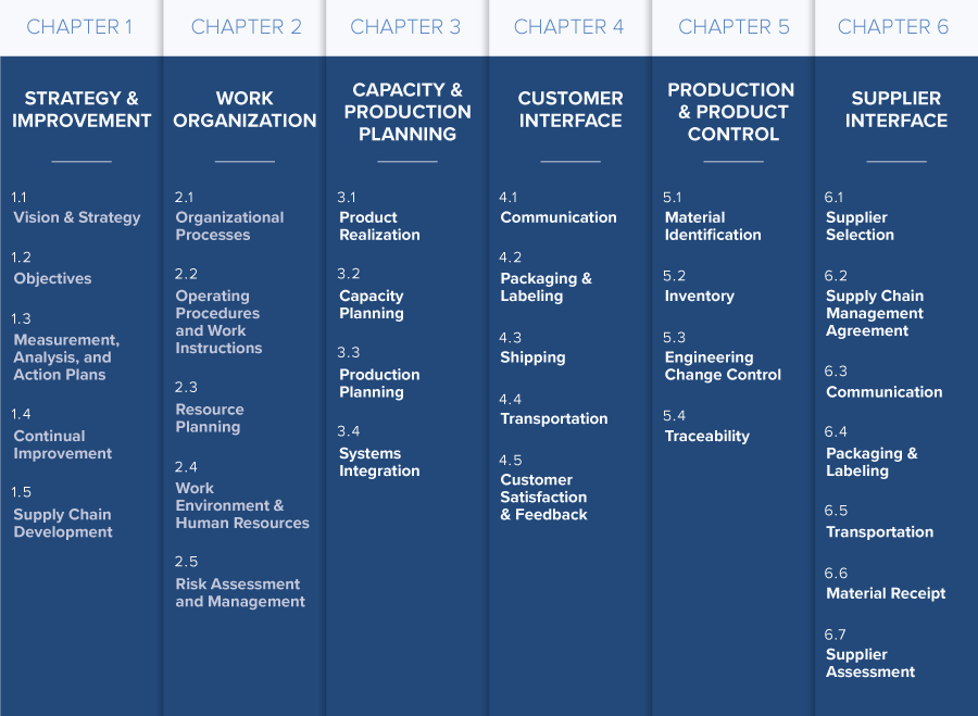 La Guía de Operaciones de Gestión de Materiales/Evaluación Logística de AIAG/Odette (MMOG/LE) proporciona a las organizaciones un sistema de gestión de la cadena de suministro. La primera versión de la evaluación MMOG/LE se introdujo en 2004 y actualmente se encuentra en su quinta revisión. A continuación se presenta el contenido de los seis capítulos de la MMOG/LE (ver figura 1).