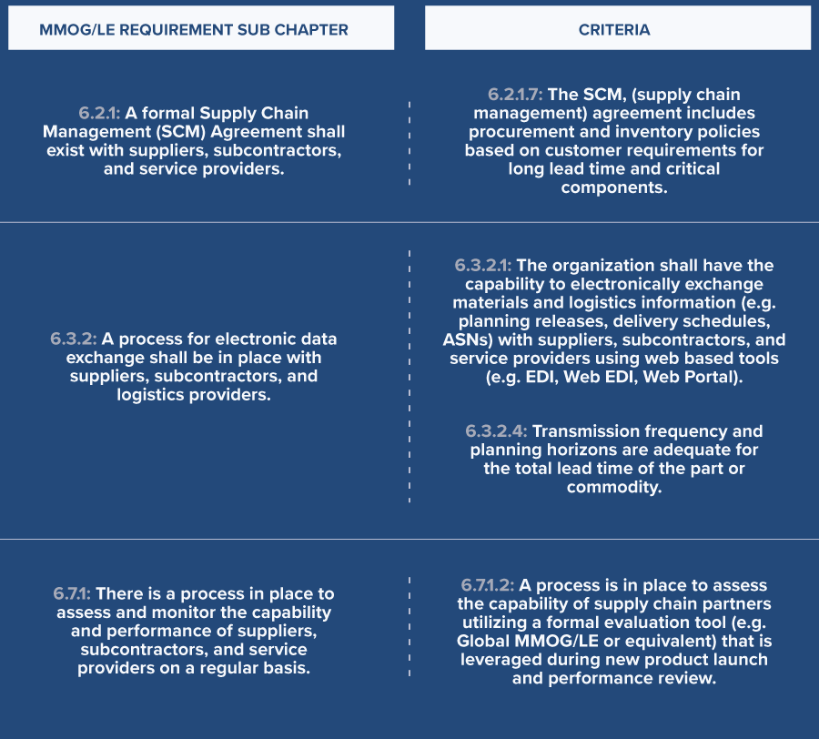 MMOG/LE ofrece un modelo de madurez de la cadena de suministro para que las organizaciones puedan autoevaluar sus procesos de la cadena de suministro basándose en las mejores prácticas del sector. Sin embargo, sólo un puñado de OEMs y proveedores de primer nivel del sector de la automoción realizan habitualmente evaluaciones de la cadena de suministro utilizando los criterios del MMOG/LE. Muchos proveedores de nivel 1 que no utilizan el MMOG/LE como herramienta con el nivel 2 suelen tener un proceso de revisión de la cadena de suministro mucho menos sólido que el MMOG/LE, lo que empeora aún más las cosas.